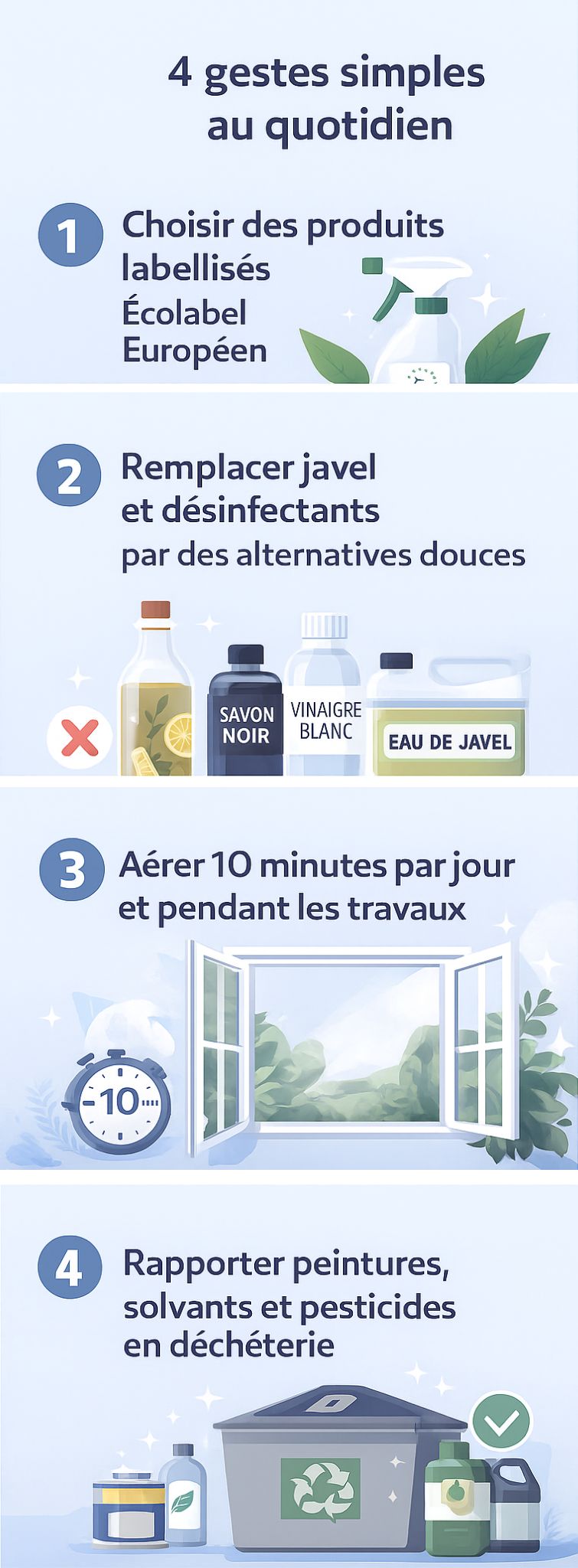 Beaucoup de nettoyants parfumés, désinfectants, détartrants ou détachants émettent des composés organiques volatils (COV) nocifs. Leur mélange peut aussi provoquer des émanations dangereuses — par exemple, l’eau de javel combinée à un produit acide ou ammoniacé forme des gaz irritants responsables de toux, irritations et crises d’asthme.